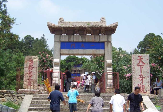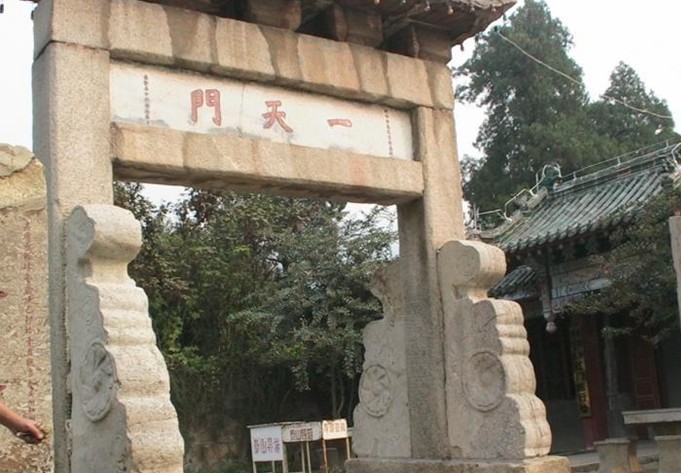 宮前三重石坊形若階梯。前為一天門坊,明代建,參政龍光題額,清康熙五十六年(1717年)巡撫李樹德重建,兩側有明代人題“天下奇觀”及“盤路起工處”大字碑。中有孔子登臨處坊,明嘉靖三十九年(1560年)巡撫山東都察院右副都御史朱衡等建,嘉靖狀元羅洪先題額并聯(lián):“秦王獨步傳千古,圣主遙臨慶萬年。”聯(lián)語于1967年被鑿毀。