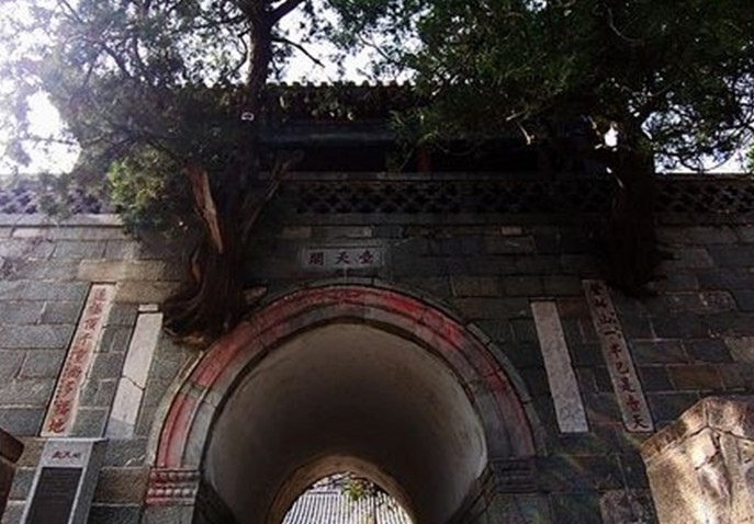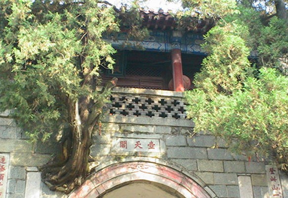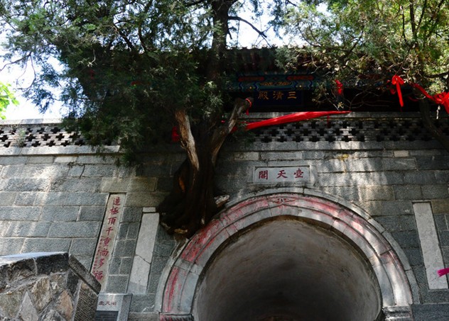 清嘉慶六年即公元1801年泰安太守崔映辰題聯(lián):“壺天日月開靈境,盤路風(fēng)云入翠微。”嘉慶二十一年即公元1816年泰安府事廷璐又聯(lián):“登此山一半已是壺天,造極頂千重尚多福地。”這里海拔為800米,大致是泰山高度的一半,門洞有雙柏自墻中橫生,東西對(duì)峙,盤旋而上,宛如守護(hù)山門的雷祖、真武二將軍,堪稱奇景。