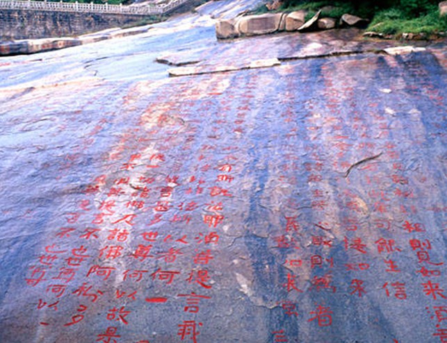 經(jīng)石峪金剛經(jīng)刻位于斗母宮東北經(jīng)石峪,是中國現(xiàn)存規(guī)模最大的佛經(jīng)摩崖刻石。 經(jīng)文刻于面積2064平方米的緩坡石坪上,自東而西刻《金剛般若波羅密經(jīng)》,采用后秦鳩摩羅什譯本,原本全1卷、32分目、5172字,經(jīng)刻只刻到15分目“特經(jīng)功德 兮”,計44行,每行125字或10字不等,凡2799字,字徑50厘米。經(jīng)刻歷千余年風(fēng) 雨剝蝕、山洪沖擊、游人踐踏、捶拓?zé)o度,已殘泐磨滅過半,現(xiàn)僅存經(jīng)文41行、 1069字(包括可認(rèn)讀的殘字和雙勾字)。