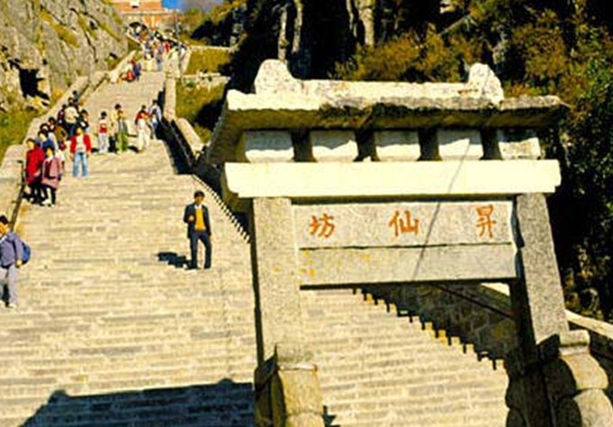 升仙坊位于山東省泰山中路緊十八盤的起始處,為兩柱單門式石坊,額題楷書“升仙坊”。此處山勢(shì)陡峻,懸崖峭壁,上臨岱頂天庭,咫尺仙境,似有飄然升仙的意境,故名“升仙坊”。游人至此小憩,每每浮想聯(lián)翩。回視山下,常有騰身云霄之感,舉首仰望,南天門近在眼前,奮力攀登,岱頂在望。 升仙坊位于南天門下。全石雙柱單門式,寬2.82米,通高4.5米,建于雙層方 石基上。基石長(zhǎng)1.82米,寬0.64米,高0.5米。柱方形,下施滾墩石,獸頭石鼓狀。