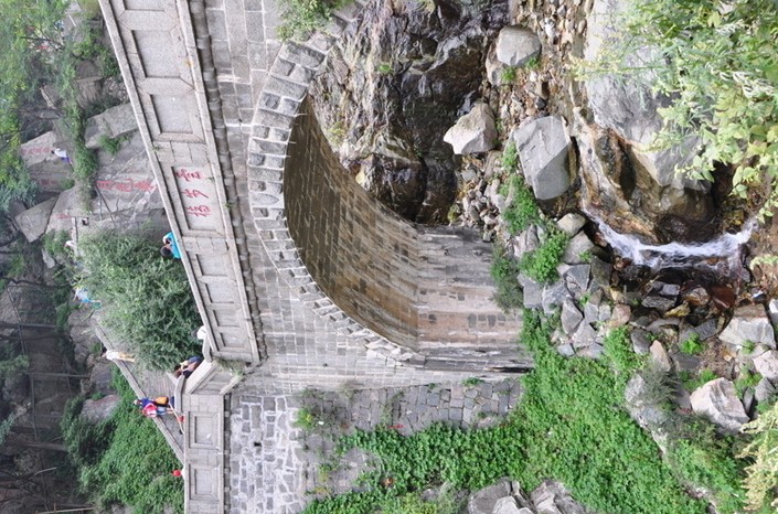 橋東有一座亭,觀瀑亭,又名酌泉亭,是清末泰安知縣所建。北側(cè)刻著一副對(duì)聯(lián):“且依石欄觀飛瀑,再渡云橋訪(fǎng)爵松。”橋周?chē)?ldquo;月色泉聲”、“云步躋天”、“絕飛流”、“聳壑昂霄”、“氣象巖巖”等題刻50余處,真、草、隸、篆,體法各一,琳瑯滿(mǎn)目。