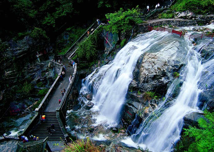 位于“斬云劍”北側(cè),是跨中溪而建的一座單孔拱形石橋。橋畔常有云氣彌漫,人行橋上,宛在天際,故名“云步橋”。橋北有大片陡峭的石崖,題刻遍布,飛瀑直下,景色絕佳,是游人駐足小憩的天然所在。東有清代建的“酌泉亭”一座,亭為石作,內(nèi)外鐫滿(mǎn)楹聯(lián)和詩(shī)文,游人可從這些石刻中,領(lǐng)略偉大的中華精神,升華心靈世界。
