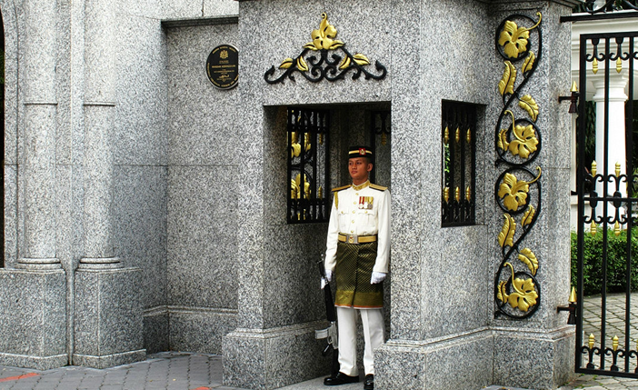 簡單的皇宮門口是由一扇并不是很寬敞的鐵門與旁邊的小崗?fù)づc小門洞組成。僅僅就這一小片風(fēng)景,就讓游客迷戀不已。鐵門是用黑色作底色,襯以金黃色作為裝飾,典雅大方,從嚴(yán)肅中透出一種高貴。在鐵門的側(cè)邊的崗樓和崗樓旁的門洞中,各有一名哨兵站崗,在崗樓中的哨兵身穿白色上衣配有綠色前裙的制服,手持長槍;在門洞中的哨兵,則穿一件紅色上衣,黑色長褲,胯下騎一匹黑色高馬,威風(fēng)凜凜,常常吸引無數(shù)鏡頭。另外,不時(shí)在門口還會站有一排杠槍哨兵供人們拍照留念,閃閃的長槍在陽光的照射下與遠(yuǎn)處阿拉伯風(fēng)格的皇宮金頂遙相呼應(yīng),分外亮麗。