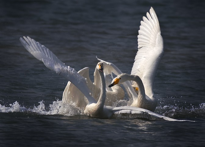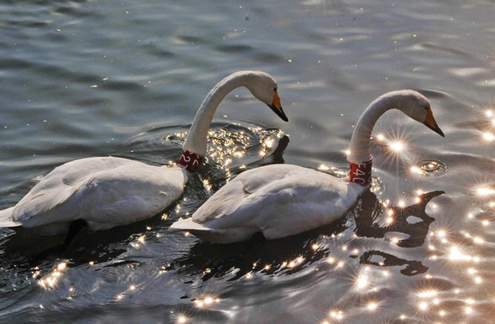每當(dāng)村民或游客走進(jìn)海灣投放食物時(shí),大天鵝就不約而同地向岸邊涌來,金色的玉米粒撒向藍(lán)色的水面和潔凈的沙灘,溫文爾雅的大天鵝也都爭(zhēng)相游到村民、游客周圍,毫不防范地?fù)屖虫覒?稍遠(yuǎn)處的還貼著水面低飛而來。版權(quán)所有山東聊城聊之旅國(guó)際旅行社有限公司,轉(zhuǎn)載必究!初見人與天鵝如此近距離地接觸,有人還以為這是一群人工豢養(yǎng)的天鵝呢,可天鵝脖子上的紅色“環(huán)志”分明在告訴他們,這可都是不遠(yuǎn)萬里飛來的野生大天鵝啊。