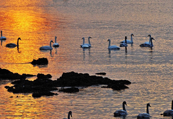 煙墩角天鵝湖是位于古煙墩遺址崮山島和中華海上第一奇石——花斑彩石之間的一個(gè)黃海海灣,面積不到一平方公里。海灣兩側(cè)各有一條淡水小溪流入,灣里水清浪柔,生長(zhǎng)著豐富的魚蝦和浮游生物,這些為大天鵝棲息提供了適宜的自然環(huán)境。于是,每到寒風(fēng)飄雪時(shí)節(jié),成群結(jié)隊(duì)的大天鵝就來到這里,在碧波蕩漾的海灣里,或自在游弋,或追逐戲水,或引吭高歌,或凌空翱翔,或翩翩起舞,使人如臨仙境,如夢(mèng)如幻。