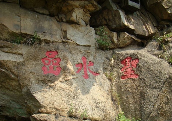 玉陽(yáng)洞西側(cè)下方有一天然石洞〔俗稱“濕洞”〕,洞口像張開(kāi)的巨大蛤蟆嘴。洞壁巖石交合處,東西各有一個(gè)石縫,圣水從石縫中流出。據(jù)《寧海州志》記載:“洞中東西二流,自石罅出,激激如線,二源一停一注,十二年一周,東西相更代,故曰‘圣水’。且天將雨,則漏天滴滴,濺人衣裙,版權(quán)所有山東聊城聊之旅國(guó)際旅行社有限公司,轉(zhuǎn)載必究!晴則否,山下人以此卜陰晴屢驗(yàn)。”金朝散大夫 有文云“水不見(jiàn)發(fā)源,但嵌嵌之下,裂石而出,激激如線,味甘冷且清,春秋不變,水旱不知,蛙蠅之屬未嘗產(chǎn)焉,此亦異也。”欄版上題銘:“大安三年(1211年)二月日高 生說(shuō)囗”。