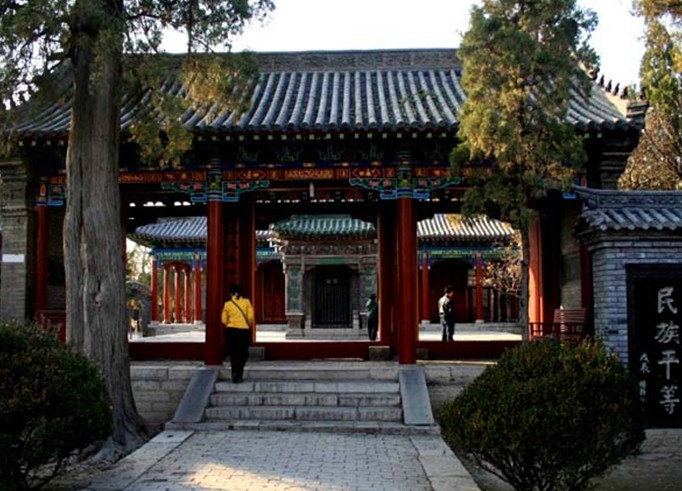 二門是單檐硬山式建筑,面闊三間,建筑面積四十五平方米。中柱五十多公分,六扇朱漆大門,檐頭雕刻伊斯蘭教經(jīng)文和圖案,工藝精湛。門內(nèi)南北兩扇墻上,鑲有四塊石碑,記述該寺歷史修二門記和禮拜時(shí)辰。三個(gè)大門上面均有匾額,正中是明成化丙戌科進(jìn)士劉瓚題字“開天正教”; 版權(quán)所有山東聊城聊之旅國際旅行社有限公司,轉(zhuǎn)載必究!右為清代鎮(zhèn)守山東登州等地的總兵官軍提督密勇巴圖魯馬建紀(jì)題字“默德真?zhèn)?rdquo;,左為清康熙二十三年掌教趙璜、張養(yǎng)心、劉翰美題字“瞻天仰圣”?,F(xiàn)存二門為乾隆二十年重修。