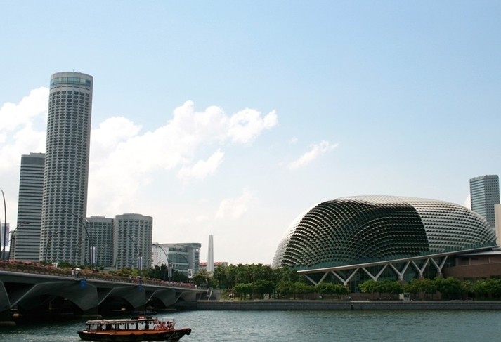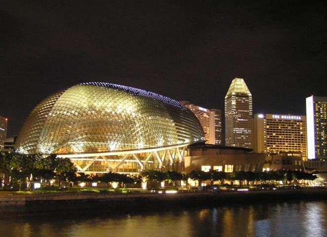 濱海藝術(shù)中心(The Esplanade),于2002年10月落成,是新加坡的地標建筑。外型奇特突出,宛若兩顆榴蓮,因此得名榴蓮藝術(shù)中心。但實質(zhì)上建筑師的靈感是采掘,根據(jù)蜻蜓的復(fù)眼來設(shè)計的。一開始可能感覺不到,當你看了濱海藝術(shù)中心的全景之后,可以越來越清晰地感到作者的想法及模仿蜻蜓復(fù)眼的逼真了。濱海藝術(shù)中心不僅外觀獨特,建筑物蘊含了不少的科學(xué)計算。它是由4,590片玻璃所組成的屋頂遮陽罩,依據(jù)新加坡日照環(huán)境的模擬計算設(shè)置。其內(nèi)部陳設(shè)卻充滿歐洲劇院風味,功能多元化,包含音樂廳、戲劇院、購物中心、餐廳及戶外表演空間等,讓東方與西方的藝術(shù)文化在此撞擊出最美的火花。