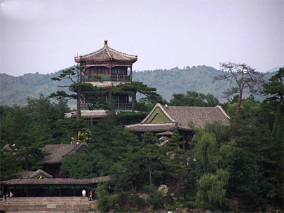 山區(qū)位于山莊西北部,面積443.5萬平方米。山區(qū)占了整個園林面積的4/5。從西北部高峰到東南部湖沼、平原地帶,相對高差180米,形成了群峰環(huán)繞、色壑縱橫的景,山谷中清泉涌流,密林幽深。當(dāng)年利用山峰、山崖、山麓、山澗等地形,修建了多處園林、寺廟。避暑山莊周圍寺廟共占地47.2萬平方米,博仁寺、博善寺、普樂寺、安遠(yuǎn)廟、普寧寺、普佑寺、廣緣寺、須彌福壽之廟、普陀宗乘之廟、廣安寺、羅漢堂、殊像寺等12座金碧輝煌、雄偉壯觀的喇嘛寺廟群,是清政府為安撫中國西北蒙、藏等少數(shù)民族,加強(qiáng)邊疆管理而建造的皇家寺廟。寺廟之集中,規(guī)模之宏大,建筑之精湛,寺廟中大量佛像、祭器制造技藝之高超,使其成為藏傳佛教圣地之一。山區(qū)多處園林解放前多遭破壞,但現(xiàn)在山區(qū)景物仍然十分迷人,其中最引人注目的是遙相對立的兩個山峰上的亭子,一個叫“南山積雪”,一個叫“四面云山”。在亭子上遠(yuǎn)眺,山莊的各風(fēng)景點(diǎn),山莊外的幾座大廟,以及承德市區(qū),周圍山上的奇峰怪石,都可以一覽無余。在另一座山峰上還有一座亭子叫“錘峰落照”,在這里磬錘峰首先映入眼簾,每當(dāng)夕陽西照,磬錘峰被紅霞照得金碧生輝,故名“錘峰落照”。