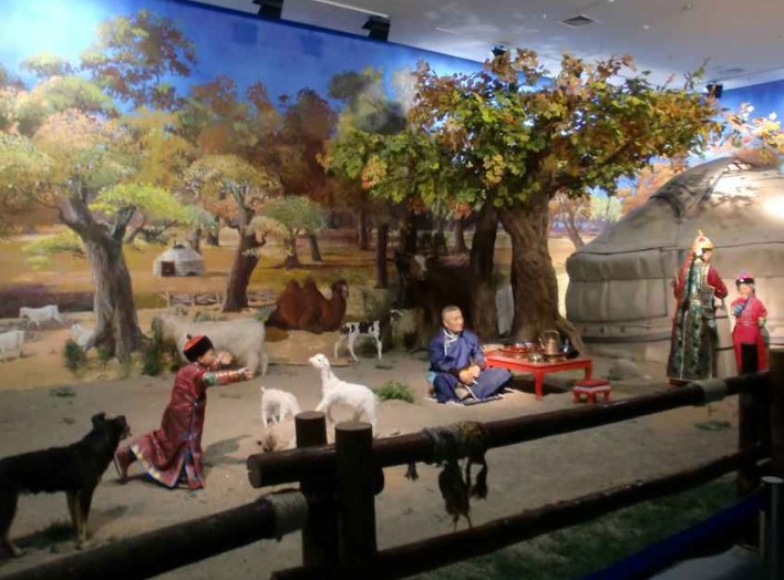 博物館阿拉善民族民俗展廳,建筑面積1300平米,展有款式多樣的阿拉善蒙古族服飾、代表禮儀至尊的阿拉善烤全羊、聞名遐邇的阿拉善蒙古族養(yǎng)駝馴駝技藝、工藝精湛的阿拉善仿古地毯、悠揚(yáng)綿長的長調(diào)民歌、英武雄健的沙力搏爾式摔跤和神奇精湛的阿拉善蒙醫(yī)蒙藥等139件裝飾實(shí)物和民間藝術(shù)品。