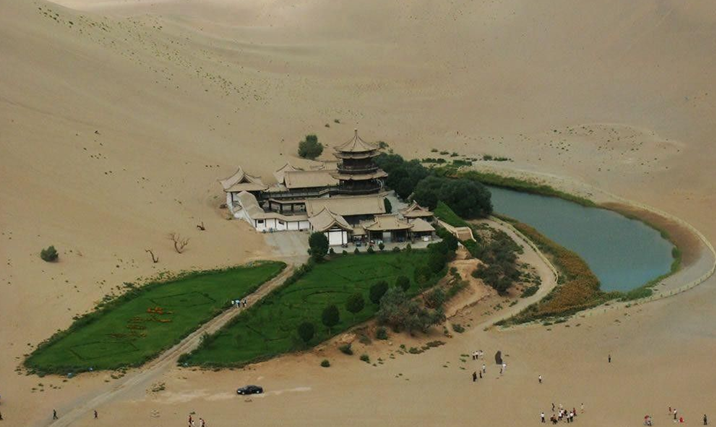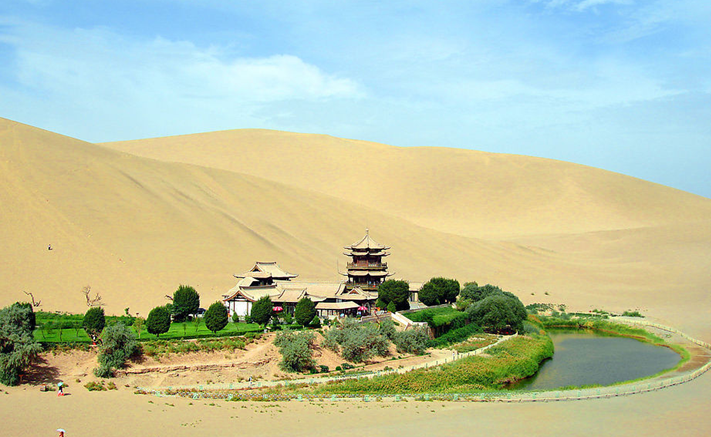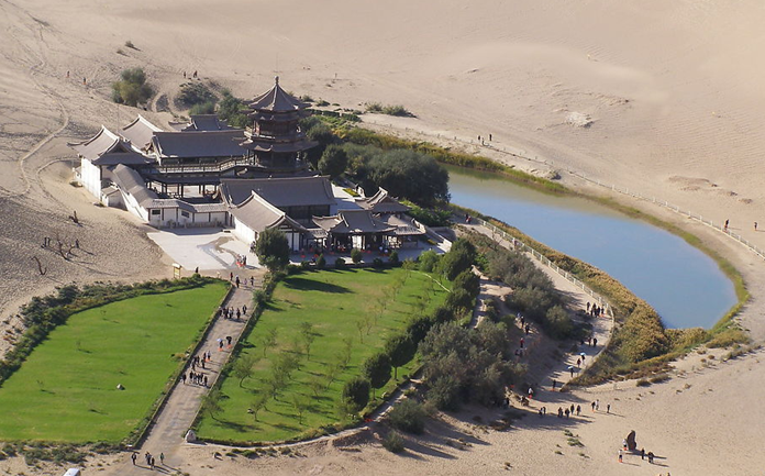 五十年代測(cè)量,月牙泉東西長(zhǎng)218米,中斷最寬處54米,平均水深5米,最深處7米余。南岸原有廟宇百余間,但十年動(dòng)亂中焚毀,農(nóng)業(yè)大躍進(jìn)時(shí)又抽水灌田導(dǎo)致池面嚴(yán)重縮小。近年修復(fù)古建、掏泉疏水、治沙綠化,才有今天面貌。臺(tái)灣易經(jīng)研究專家張淵量博士1993年游河西時(shí)根據(jù)易經(jīng)、易理考證認(rèn)定月牙泉即王母娘娘蟠桃盛會(huì)之瑤池也,信否隨意。