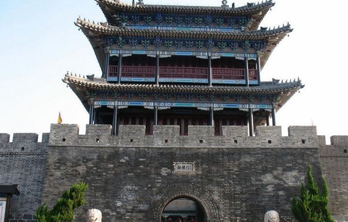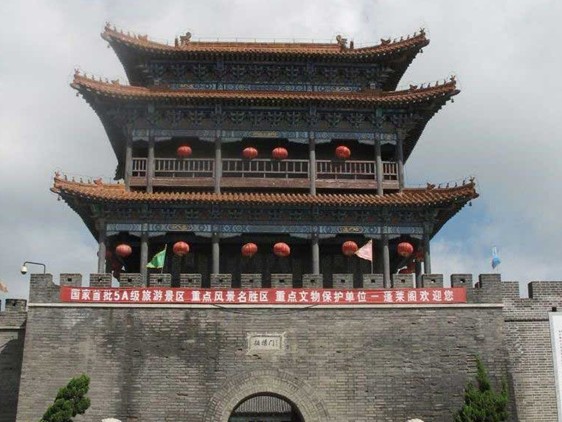 1987年修復(fù),門洞拱頂,寬3米,高5.3米,進(jìn)深13.75米,門洞上方嵌“振揚(yáng)門”匾額,字為吳作人手筆。門樓為兩層閣樓,外觀三層飛檐(俗稱“三滴水”),屋面開山,覆琉璃瓦,脊置六獸,檐角下系風(fēng)鈴,門樓四周為明廊,一層底面與城墻齊高,南北明廊外側(cè)為城堞,二層重檐,明廊柱間有木欄環(huán)繞。振揚(yáng)門兩側(cè)各修復(fù)城墻約50米,門前建有5000平方米廣場(chǎng)。自1989年始,每年的蓬萊經(jīng)貿(mào)懇談會(huì)開幕式均在此舉行。1991年世界旅游日登州古市慶典活動(dòng)亦在此舉行迎賓儀式。