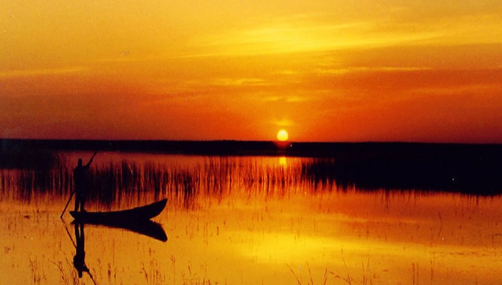 遠(yuǎn)看湖面,黑壓壓的一片,像是塘上殘留的荷蒂。走近了才看清,原來都是鳥兒。黑色的是野鴨,白色的是白鶴,雜色的竟是鴛鴦。其實(shí)種類還多著呢,連當(dāng)?shù)厝艘舱f多得叫不出名字來。鳥兒看見人走近了,前面的就往后邊飛去,如是一撥又一撥地飛飛停停,像跟你開著一個(gè)永遠(yuǎn)的玩笑,也跟你保持著一定的距離,這時(shí)你會(huì)認(rèn)同書上所說的:這是在全球荒漠和半荒漠地區(qū)中,為數(shù)不多的鳥類遷徙地和繁殖地。最難忘的還是烏梁素海的日落。只見夕陽映在湖面上,變成一條金色的柱子,從遠(yuǎn)方地平線的湖面上延伸而來,九十度筆直地豎在你的跟前。只有偶爾飛起的野鴨或鳥兒掠過金柱,生就帶出一筆畫意。當(dāng)夕陽完全西沉了,這時(shí)飛鳥的啁啁聒噪聲,像是在惜別黃昏,再見夕陽。