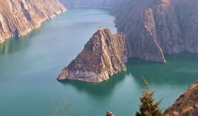 在甘肅永靖縣境內(nèi)。黃河兩岸崇山峻嶺, 形成峽谷。1974年建成具有發(fā)電、防洪、灌溉、養(yǎng)殖、航運等功能的綜合性水利樞紐工程。一條長840米、高147米的巨大攔河壩把黃河攔腰斬斷, 形成了劉家峽水庫(庫容57億立方米,水域面積130平方公里),大壩下安裝了五臺國產(chǎn)大型水輪發(fā)電機組,成了總裝機容量122.5萬千瓦年發(fā)電量57億度的黃河上游第一座水力發(fā)電站。