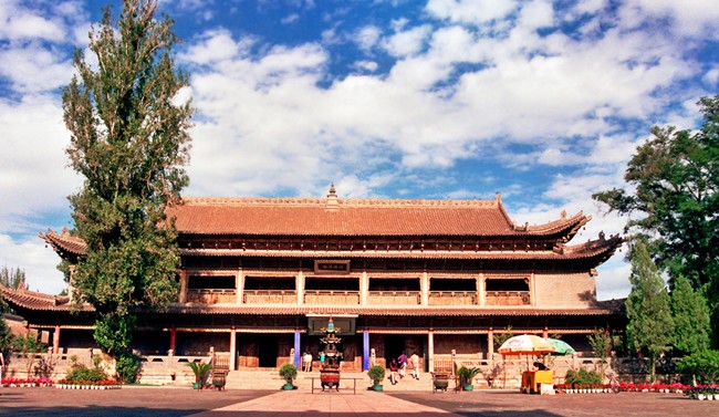 史載西夏國師嵬眻在此掘出一翠瓦覆蓋的臥佛而初建大佛寺?,F(xiàn)存建筑有大佛殿、藏經(jīng)閣、土塔三處。大佛殿殿高33米,面闊9間,規(guī)模宏大。殿門兩側(cè)各鑲以六平方米的磚雕一塊,左為“登極樂天”、“西方圣境”,右為“入三摩地”、“袛園演法”。殿內(nèi)有木胎泥塑佛像,金裝彩繪,形態(tài)逼真,視之若醒,呼之則寐。臥佛身后塑十大弟子,兩側(cè)廊房塑十八羅漢,殿內(nèi)四壁為《西游記》和《山海經(jīng)》壁畫。藏經(jīng)閣內(nèi)珍藏有明英宗頒賜的六千多卷佛經(jīng),經(jīng)文保存完好,以金銀粉書寫的經(jīng)文最為珍貴。版權(quán)所有山東聊城聊之旅國際旅行社有限公司,轉(zhuǎn)載必究!寺后有一33.37米高的土塔,為張掖五行塔之一,其一、二層臺座四隅各建一小塔,風(fēng)格獨特,為國內(nèi)罕見。
