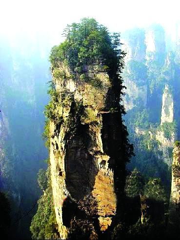 黃石寨南天一柱登黃石寨的途中,約一半的路程處,南天門上行120米.南天一柱又稱指天峰,位于天子山索道上站右側(cè),沿公路下行250米處,一峰依谷而立,沖天而起,柱峰高200余米,下大中細(xì),頂呈鑼槌形。峰頂叢生蒼松,直指藍(lán)天。