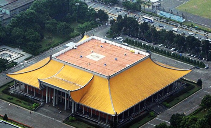 紀(jì)念館高30.4公尺,每邊長(zhǎng)100公尺,由每邊14支灰色大柱,頂起翹角像大鵬展翼的黃色大屋頂,安靜地坐落在十萬(wàn)公尺見(jiàn)方的平地中央,四周叢林、花草、廣場(chǎng)圍繞,突顯建筑物和環(huán)境的對(duì)比,引人注目,給人第一個(gè)感覺(jué)是宏偉,很有氣勢(shì)。巍峨莊嚴(yán)的建筑本體,粗獷剛強(qiáng),樸素中又不失應(yīng)有的細(xì)致,所以國(guó)父紀(jì)念館外觀宏偉、高雄、簡(jiǎn)潔、明爽、有力,不但使人產(chǎn)生景仰,也令人感到力與美的結(jié)合。
