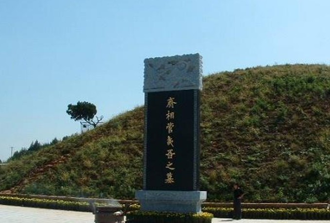 在臨淄城南牛山北麓,墓高14米,東西34米,南北近14米。后人登臨牛山,總免不了在管仲墓前留連一番,毛維騶曾慨嘆:“幸脫當年車檻災,一匡霸業(yè)為齊開。可憐三尺牛山土,千古長埋天下才”。舊時墓前曾立一石碑刻有此詩,今已無存。
