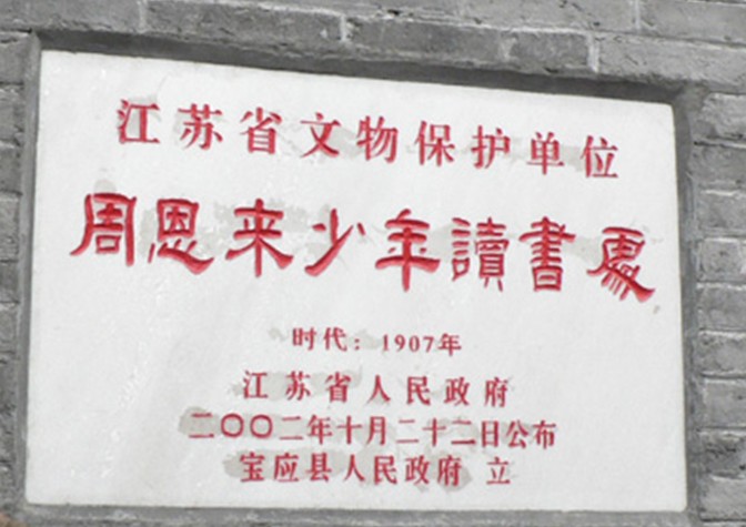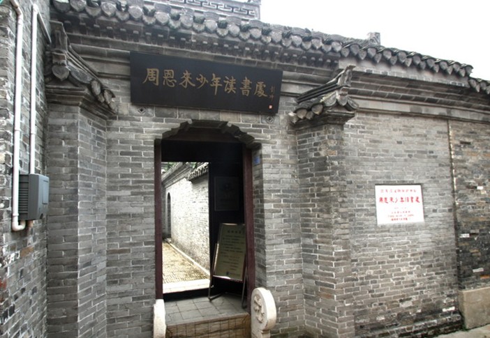 周恩來(lái)少年讀書(shū)處位于中國(guó)江蘇寶應(yīng)縣城水巷口3號(hào),原為周恩來(lái)外祖父陳沅的宅第。周恩來(lái)少年讀書(shū)處位于江蘇省寶應(yīng)縣城縣南街水巷口3號(hào),原為周恩來(lái)同志的外祖父陳沅的宅第,整個(gè)建筑為清代風(fēng)格,分東西兩個(gè)院落,共十八間房屋,建筑面積500平方米,占地面積700多平方米。1996年寶應(yīng)縣政府組織全面修繕,恢復(fù)原貌,1998年3月5日周恩來(lái)同志誕辰100周年正式對(duì)外開(kāi)放。