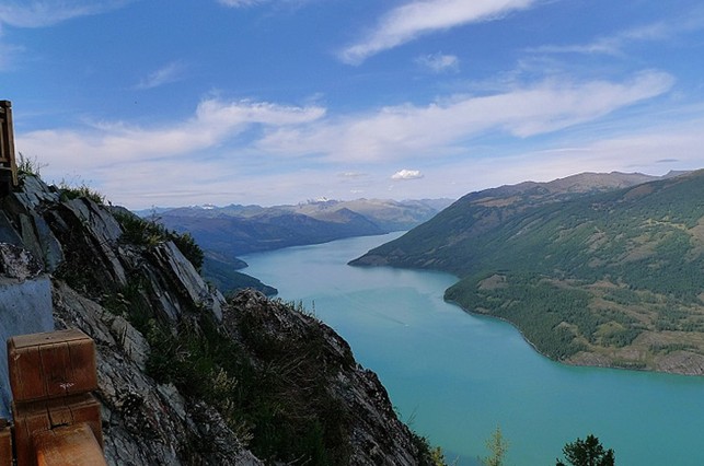 觀魚亭建于海拔2030米的哈拉開特(蒙古語(yǔ)意為駱駝峰)山頂上,與湖面的垂直落差達(dá)600多米,因處于觀察“湖怪”的最佳位置,故得名觀魚亭。去觀魚亭有兩條路可供選擇:一條是乘汽車從山后繞行到山腰;另一條是從湖出水口山前專為爬山者鋪設(shè)的石階盤旋步行而上。