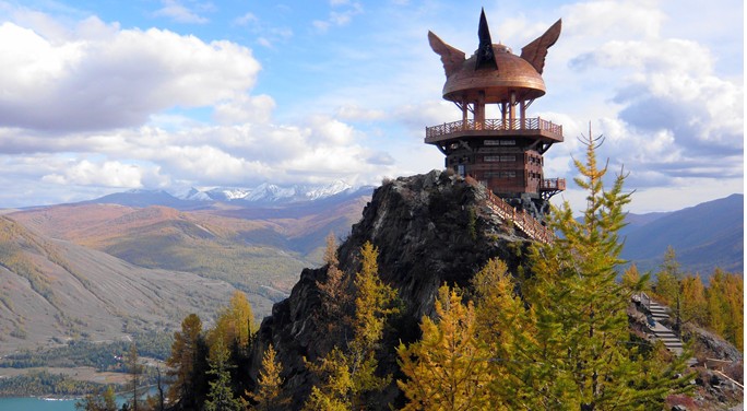 觀魚亭建于海拔2030米的哈拉開特(蒙古語(yǔ)意為駱駝峰)山頂上,與湖面的垂直落差達(dá)600多米,因處于觀察“湖怪”的最佳位置,故得名觀魚亭。