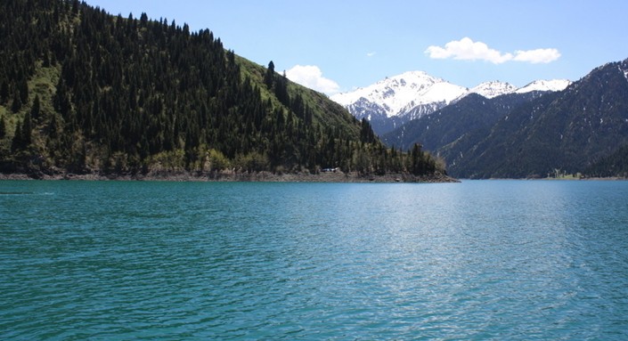 游天池可從烏魯木齊乘汽車前往,上山時(shí)山路蜿蜒曲折,伴隨一條奔騰的溪流,這是來自天池的水,清澈的溪水沖擊巖石時(shí)激起雪白的浪花,使人感到一股清新氣息。