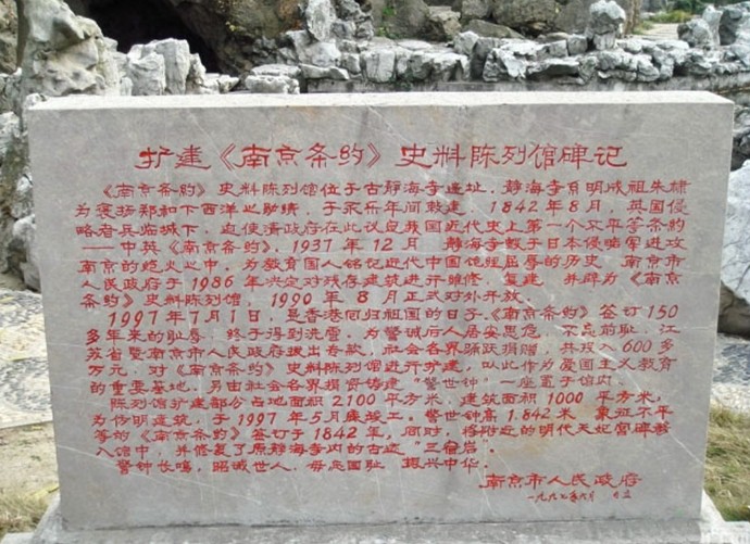 《南京條約》史料陳列館,位于南京市獅子山西麓的古靜海寺遺址上,該館通過4個展廳共130余幅(件)圖片、史料和實(shí)物,向人們展示了英帝國主義侵略中國,腐敗的清政府屈膝求和、割地賠款這一中國近代史上屈辱的一幕。館內(nèi)新增的條約陳列室,陳列著我國近代(至1949年)與外國政府簽訂的1100多個條約,其中大部分是不平等條約。教育人民勿忘國恥,振興中華。