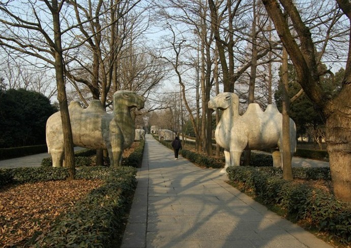 明孝陵的開創(chuàng)性地位還體現(xiàn)在其依山勢地形蜿蜒曲折的陵墓神道。陵墓的神道從四方城開始。四方城是一座碑亭,位于衛(wèi)橋與中山陵之間,是明成祖朱棣永樂三年(公元1405年)為其父朱元璋建的“大明孝陵神圣功德碑”。其頂部已毀,僅存方形四壁,內(nèi)有立于龜趺座上的石碑一塊,碑高8. 78米。碑文由朱棣親撰,計2746字,詳述明太祖的功德。碑座、碑額雕琢瑰麗。神道由此向西經(jīng)外金水橋(今紅橋),繞過梅花山再折向北,長約1800米。其中段為石象路,這段路上相向排列著12對石獸,分別是獅、駱駝、象和馬等6種,每種兩對,姿態(tài)是一對伏,一對立。后面是一對高大的華表,上雕云龍,氣勢不凡。折向北面的神道上分別列著4對身著盔甲或蟒袍的文臣武將,有些已經(jīng)損壞。石人石獸的體型都很巨大,是明代石刻的藝術(shù)珍品。南京博物院前院長梁白泉研究員說:“明孝陵首開了第一代皇帝陵寢的神道作為后世子孫陵寢共用神道的制度。神道兩邊分布的12對石像生和4對石人,石刻風(fēng)格多樣,造型厚重簡樸,融整體宏大與局部精細為一體,也代表了中國明初石雕藝術(shù)的最高水平。”