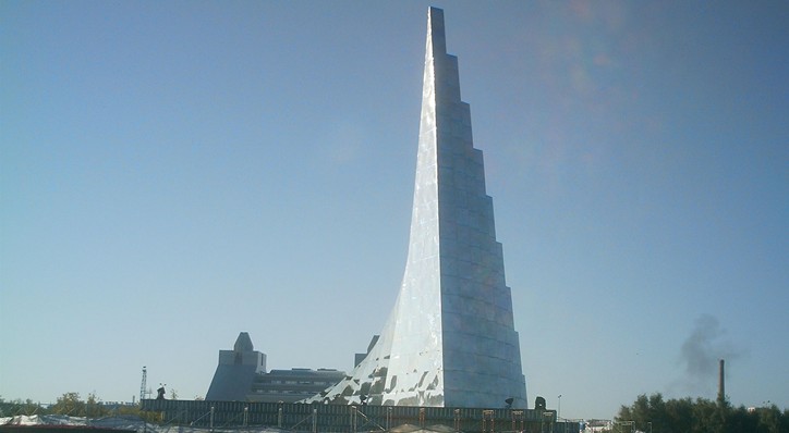 廣場內的主體雕塑命名為“騰飛”,她既像一個翅膀,又像一頁角帆,她高27米,采用鏡面不銹鋼板制成,耀眼發(fā)光,象征大慶油田蓬勃向上的氣勢,充分展示了大慶石油工人開拓進取,創(chuàng)造美好未來的抱負與理想。