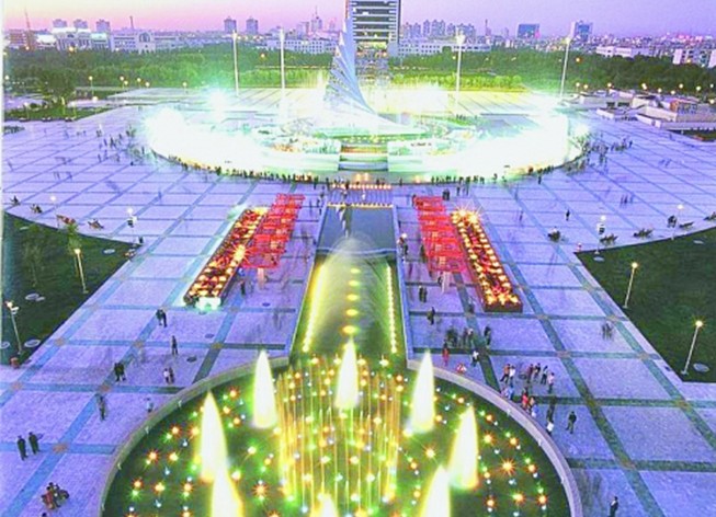 音樂噴泉是圍繞主體雕塑而設置的,分別有中心音樂噴泉,環(huán)形音樂噴泉,旱噴泉、激光水幕四部分,其中,中心音樂噴泉的4個25米高的主噴泉噴涌時,在效果燈、五彩燈和地埋燈的映照下,五彩繽紛,令人驚嘆,廣場西側的金字型建筑,就是激光水幕控制室,反映在水幕上的各種景物,都來自這個控制室的操作。