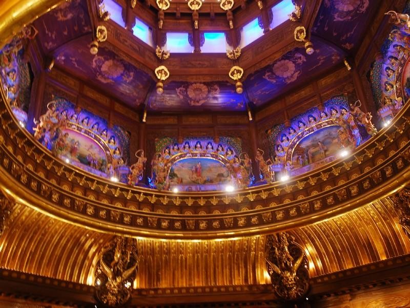 梵宮內部各建筑空間獨立且互相貫通,由門廳、廊廳、塔廳、圣壇、三傳會議廳、千人宴會廳等組成。精雕細琢的東陽木雕、敦煌技師的手工壁畫、光燦奪目的琉璃巨制、精致典雅的甌塑浮雕壁畫、技藝精湛的揚州漆器、恢宏大氣的油畫組圖、古雅精麗的景泰藍須彌燈、精美的景德鎮(zhèn)青花斗彩缸……這些匯集眾多文化遺產、眾多藝術瑰寶的藝術珍品遍布靈山梵宮的各個區(qū)域,將優(yōu)秀的傳統(tǒng)文化演繹得淋漓盡致,令人目不暇接、回味無窮。