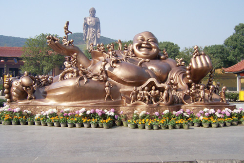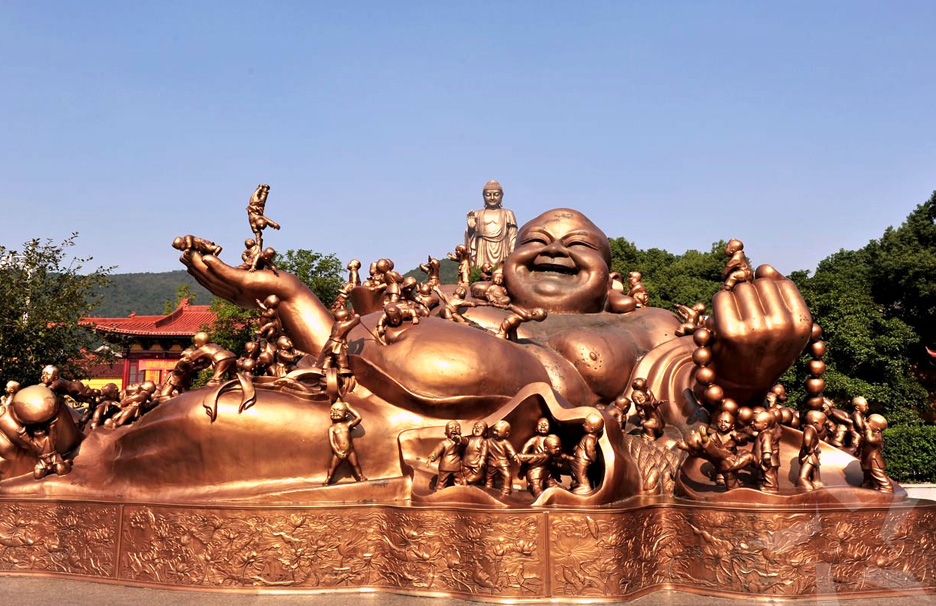 天下第一掌位于佛手廣場行道的左側,是按靈山大佛右手復制,且形狀大小完全一樣的銅質手掌,它的總高度為十一點七米,寬五點五米,手指直徑一米,總重量達十三噸,掌心的千輻輪,直徑達二米。天下第一掌是靈山勝境香火最旺的景點之一,當初設置這只巨掌,一是為了讓游客更直觀地感受八十八米靈山大佛的宏偉,另一方面是由于靈山大佛太高大,讓香客游客難以親近,所以將右手獨立,供大家瞻仰、撫摸,在靈山,有"摸佛手有福氣,摸佛腳有靈氣"的說法。這是因為這只右手的印上是"施無畏印",佛教的說法是寓意除卻眾生痛苦,撫慰眾生心靈,佛掌心的千輻輪,是佛的三十二相之一,喻示***長轉的意思,佛手指之間,有膜相連,象水禽足趾的蹼一樣,稱為手足縵網(wǎng)相,也是佛的三十二相之一。
