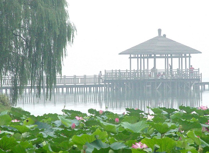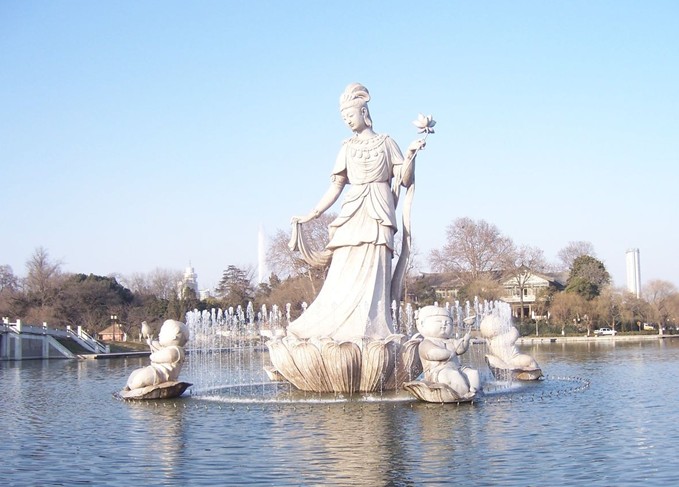 從玄武門開始,一條形如玉環(huán)的陸地,從南北兩面深入湖中,即為環(huán)洲。步入環(huán)洲,碧波拍浪。細柳依依,微風拂來,宛如煙云舒卷,故有“環(huán)洲煙柳”之稱。洲南端假山瀑布盡顯江南園林美感,石峰中有形似觀音的觀音石,是宋代花石綱的遺物。過觀音石,有東晉文學家郭璞的衣冠冢。洲北岸蓮花港畔有喇嘛廟、諾那塔、湖光塔影,獨具幽情。湖上還有月季園、兒童樂園、兒童友誼樂園、登月火箭等游樂點。