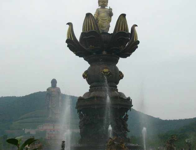 根據(jù)佛教典籍《本行經(jīng)》記載:佛祖釋迦牟尼一誕生就能說話會(huì)走路,他向東南西北四個(gè)方向各走了七步,每走一步,地上就開出一朵蓮花。他一手指天,一手指地,說道:“天上天下,唯吾獨(dú)尊”,這時(shí)候花園里忽然出現(xiàn)了兩方池水,天空中出現(xiàn)九條巨龍,吐出水柱,為其沐浴凈身。這個(gè)故事十分神奇,讓人浮想聯(lián)翩。更難得的是,靈山勝境的大型音樂動(dòng)態(tài)群雕“九龍灌浴,花開見佛”再現(xiàn)了故事中的絢麗景象。在九龍灌浴廣場,我們可以看到一座含苞待放的巨大蓮花銅雕矗立在前方,巨大的荷花由四個(gè)威武的大力士托起,底部襯托著白色的圓形大理石水池,九條飛龍和八個(gè)形態(tài)各異的供養(yǎng)人環(huán)繞著巨大的水池。