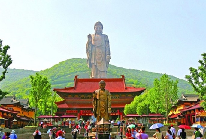 靈山的歷史可追溯到1000多年前的唐代,相傳玄奘西天取經(jīng)歸來,游歷東南到此,來到現(xiàn)在的小靈山,見“層巒叢翠”,景色非凡,大為贊賞,曰“無殊西竺國靈鷲之勝也”!于是就給此山起名小靈山。印度的靈鷲山,就是釋迦牟尼得道成佛的地方,是著名的佛教圣地,并囑大弟子窺基在這里主持開法。小靈山寺就由此逐漸發(fā)展。矗立在小靈山南麓的靈山大佛,包括蓮花座在內(nèi)通高為八十八米,相當(dāng)于一幢三十馀層樓房的高度,比“山是一尊佛,佛是一座山”的四川樂山大佛還要高出十七米,是迄今為止我國最高的巨型佛像。如果加上三層座基,總高度達(dá)一百零一點(diǎn)五米。靈山大佛雙目垂視,眼神睿智慈祥。不論游客靠近或走遠(yuǎn),似乎都在大佛眼神的關(guān)切之中;并且隨著人的靠近或遠(yuǎn)離,眼睛仿佛在微微開合,靠得愈近,眼睛就睜得愈開;嘴角似笑而未笑,欲言而未語,諸多囑咐即將出口,使人倍感親切,引發(fā)種種遐想。靠近大佛向上仰視,湛藍(lán)的天空中白云悠悠,讓人產(chǎn)生佛在“動(dòng)”的感覺。靈山大佛身體各部勻稱適度,衣飾褶紋明快流暢、飄逸靈動(dòng),更增加了動(dòng)感,使遠(yuǎn)觀近瞻都十分相宜。