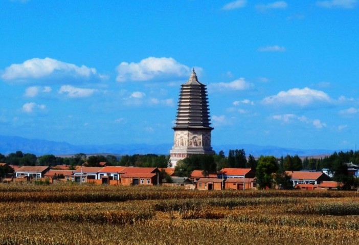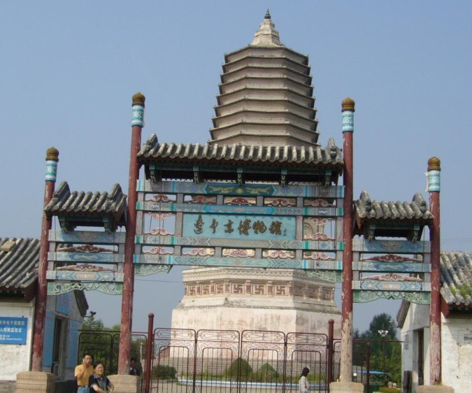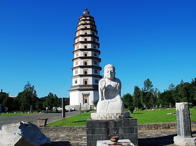 這座八角十三級(jí)密檐式磚塔,高80.22米,塔基底徑48.6米,塔體直徑34米,在現(xiàn)存遼塔中雄居魁首。據(jù)元一統(tǒng)志載可能建于遼重熙四年(公元1036年)。塔身赤面有兩行蒙文,內(nèi)容是:“大清咸豐甲寅年敬修”,為清代補(bǔ)修所寫。