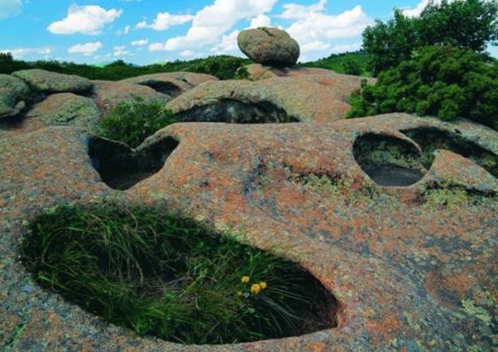 青山園區(qū)位于克什克騰地質(zhì)公園東部,包括關(guān)東車景區(qū)和青山景區(qū),面積37.13km。形成于1億多年前的花崗巖在風(fēng)蝕、重力等外力的長(zhǎng)期作用下形成了關(guān)東車景區(qū)內(nèi)形態(tài)各異的峰林地貌,如蒼鷹、似巨龍,惟妙惟肖,神采奕奕。而在青山景區(qū)面積約1000m平緩起伏的花崗巖石面上,分布著200多個(gè)呈橢圓形、圓形或不規(guī)則半圓形的巖臼,被稱作“九缸十八鍋”。它們形狀如臼如缸、如碗如匙、如鼓如盤、如杯如桶,全面展現(xiàn)了巖臼的不同發(fā)育階段,是至今為止世界上規(guī)模最大、保存最好、類型最全的巖臼群。