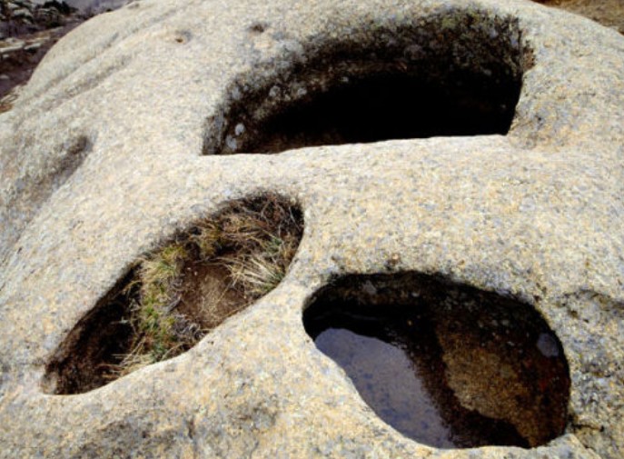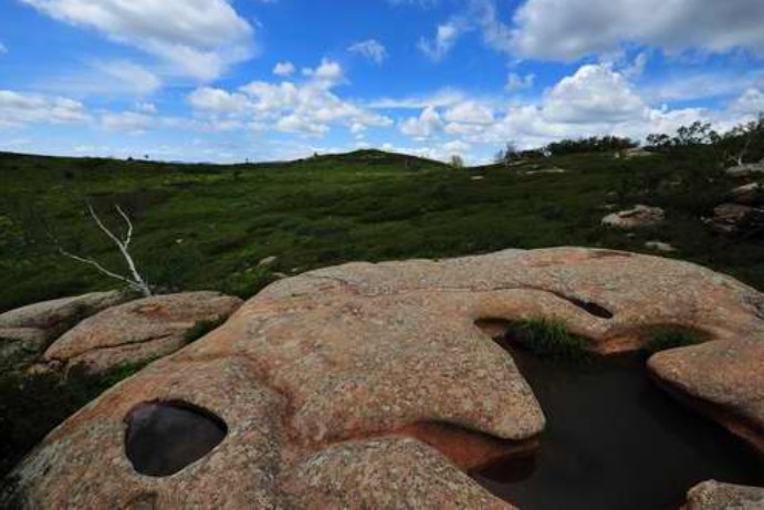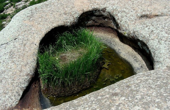 青山自然保護區(qū)位于海拔1574米的青山山體上,在山頂頂峰分布著各種各樣的冰臼,其平面上多數(shù)呈圓形、近圓形、橢圓形和不規(guī)則的形狀。有的象葫蘆,有的象梅花,有的象瓜子。一般冰臼口稍小,中下部較大,底多較平或呈鍋底微凹。形體“似臼”、“似盤”、“似盆”、“似匙”等,可以說應(yīng)有盡有。其中較深的冰臼多呈口小、肚大和底平特征??诓可暇墡в腥笨冢ɑ蜷_口),缺口有大有小,有深有淺。一般臼口寬約0.3~2米,深0.1~2米左右。最大的直徑達10.5米,深4.5米;最小的只有幾公分,似一般鈕扣大小。據(jù)調(diào)查統(tǒng)計,在方圓不到2平方公里的范圍內(nèi),就有大小不一的冰臼1000多個。有的冰臼光潔如洗,無任何殘留物和充填物,但很多冰臼中,都填滿風(fēng)塵黃土物質(zhì),已長滿花、草或喬木、灌木,形成大小不同的“天然盆景”,置于堅硬平坦的花崗巖山脊上,十分壯觀,給人極大的神奇感和奧秘感。