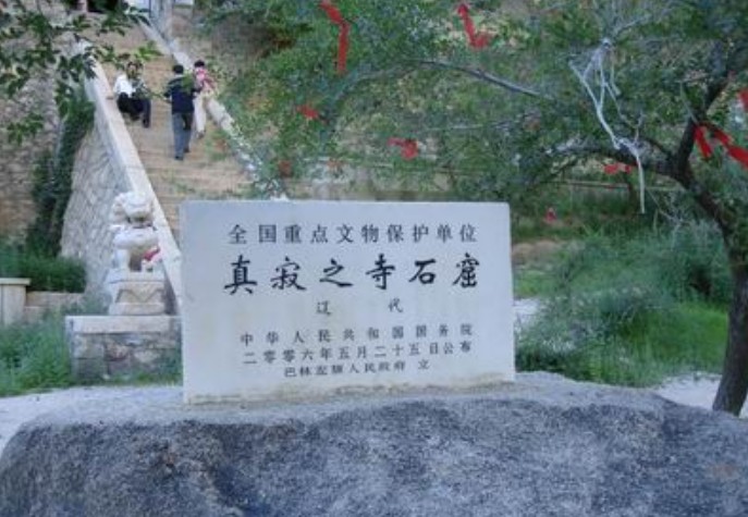 遼代石窟“真寂之寺”即林東后召?gòu)R石窟寺。其寺位于遼上京南15公里的山谷中。石窟開鑿在桃石山東南面陡壁上,分中、南、北三窟??咔笆乔宕m(xù)建的喇嘛廟“善福寺”。中窟眉額刻“真寂之寺”四個(gè)大字,當(dāng)為遼代開鑿石窟的題名。“真寂”二字與中中窟內(nèi)釋迦牟尼“圓寂”之意相合。窟內(nèi)釋迦臥佛像周圍有佛弟子像若干,做悲哀狀??弑谟星Х鹣癜儆嘧?,形象各異,南窟雕像中間為佛,騎獅子和象的文殊、普賢二菩薩分列兩邊,又有供養(yǎng)人服侍,窟門口有金剛力士像。北窟分內(nèi)外兩室,外室雕像同于南窟,內(nèi)室造像均為浮雕,有佛、弟子和供養(yǎng)人,兩側(cè)刻有胡服裝束力士像一對(duì),頗具特色。桃石山谷口兩側(cè)緣石壁立有兩尊金剛力士浮雕,十分生動(dòng),一東一西,各自把定金剛杵,足踏耐熏二鬼,另在巖壁和巨石之上多有清代陽(yáng)刻梵文:“六字真言”。“真寂之寺”附近的山谷中還有石窟若干,其中有遼史所記弘福寺及開化寺遺址,諸多跡象表明這里是遼、清兩代弘揚(yáng)佛法的對(duì)地。