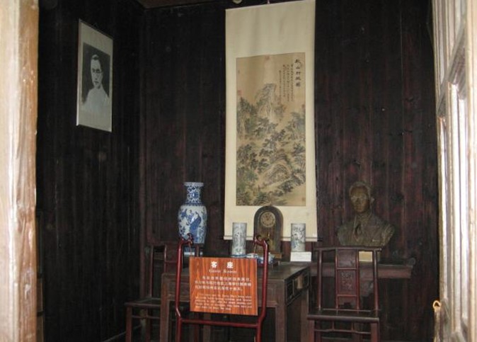 這些清代木椅、案幾、八仙桌等都是當(dāng)年朱家的日用家具,條案上的座鐘、花瓶、石屏擺件、燭臺(tái)和觀(guān)音像是老揚(yáng)州居民家中普遍的陳設(shè)。寓意“終生平安”。墻上的“開(kāi)張?zhí)彀恶R,奇逸人中龍”的對(duì)聯(lián)為清代康有為所撰,山水畫(huà)是康熙年間著名畫(huà)家王原祁作品。使朱家處處留存著傳承書(shū)香。 東廂房的兩張大床、梳妝臺(tái)、案幾、大櫥、桌子及其它陳設(shè),都是當(dāng)年朱自清的父母和兩個(gè)女兒的所用之物。墻上的兩張照片一張是朱自清的母親,另一張就是《背影》里的那個(gè)慈愛(ài)的讓朱自清的“眼淚很快流下來(lái)”的父親——朱鴻鈞。