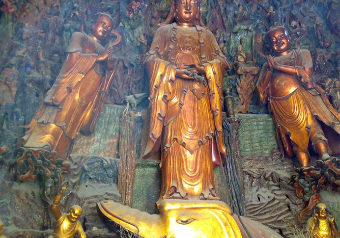過天王殿為庭院,院中古木參天,正面是大雄寶殿,重檐高33.6米,十分雄偉。大殿正中是一座高24.8米的釋迦牟尼蓮花坐像,造像“妙相莊嚴”、“氣韻生動”,是一件不可多得的宗教藝術(shù)作品。正殿兩邊是二十諸天立像,殿后兩邊為十二圓覺坐像。大殿后壁有“慈航普渡”、“五十三參”海島立體群塑,共有佛像150尊,正中為鰲魚觀音立像,手執(zhí)凈水瓶,普渡眾生,下塑善財童子,說是善財童子拜觀音的故事,善財童子參拜名師53位,第27參拜見觀音得道成佛。觀音兩側(cè)為第子善才與龍女,上有地藏菩薩,再上面是釋迦牟尼雪山修道的場景:白猿獻果、麋鹿獻乳,整座佛山造型生動,很有藝術(shù)價值。