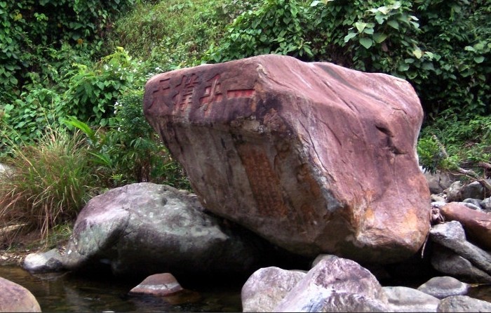 位于海南瓊中縣上安鄉(xiāng)仕階村,在五指山與湯匙嶺之間的東邊大巖石上,距五指山僅5公里,距上安鄉(xiāng)13公里,離縣城營(yíng)根39公里。一片清代光緒十三年春砌志,是清朝將領(lǐng)馮子才及幕僚刻石,其中,“手辟南荒”、“一手撐天”、“百越鎖鑰”、“巨手擎天”等摩崖石刻群。字大如斗,筆法渾厚,氣勢(shì)磅礴。明代大學(xué)士邱浚的詠五指山詩(shī)曰“五峰如指翠相連,撐起炎荒半壁天。夜盥銀河摘星斗,朝探碧落弄云煙。雨余玉筍空中現(xiàn),月出明珠掌上懸。豈是巨靈伸一臂,遙從海外數(shù)中原”。
