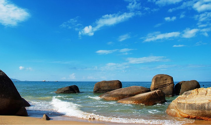 天涯海角游覽區(qū),位于三亞市區(qū)西南23公里處,陸地面積10.4平方公里,海域面積6平方公里,背負馬嶺山,面向茫茫大海,是海南建省20年第一亮麗品牌。這里海水澄碧, 煙波浩瀚,帆影點點,椰林婆娑,奇石林立水天一色。海灣沙灘上大小百塊石聳立,“天涯”、“海角”和“南天一柱”巨石突兀其間,昂首天外,崢嶸壯觀。 海上游樂項目多:海水浴場、釣魚臺、海上游艇、天涯購物寨、石沉大海漫游區(qū)、天涯畫廊、天涯民族風情園、天涯歷史名人雕像、點火臺、望海閣、懷蘇亭、熱帶。