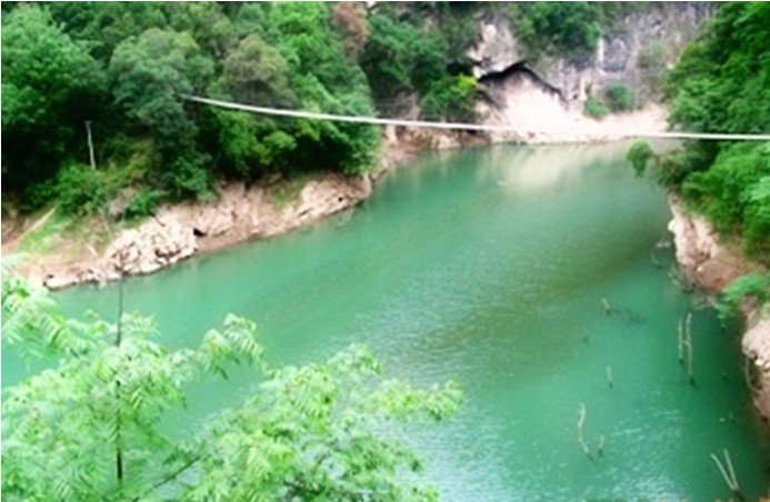 距松柏鎮(zhèn)24公里,該湖位于海拔500米的高山上,水深30米,長(zhǎng)12公里,是一個(gè)水庫(kù)。湖口有一個(gè)高54米、寬百余丈的瀑布,還有一道鐵索甩橋,橋面晃動(dòng)得十分厲害,要走過(guò)去是需要勇氣的。在湖邊的山壁上還有兩股溫泉,現(xiàn)已修建了溫泉池,可供游人沐浴。