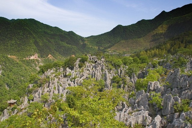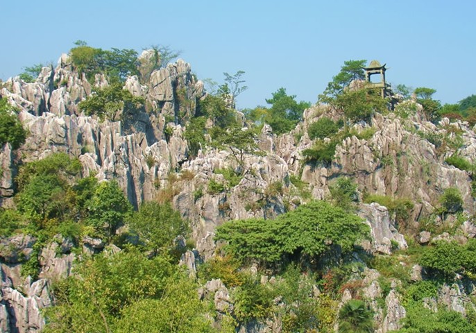 千島湖石林景區(qū)面積20平方公里,是中國四大石林之一。它位于杭州地區(qū)西邊的淳安縣千島湖,其面積之廣,規(guī)模之大,景觀之奇在華東地區(qū)堪稱一絕,被稱為“華東第一石林”。千島湖石林是一個迷宮式的溶巖地貌景觀,由藍玉坪、玳瑁嶺、西山坪組成。區(qū)內群峰壁立,層巒疊嶂,石壁、石柱、石筍、石洞等體態(tài)紛呈,各具特色,有“華東第一石林”的美譽。是我國四大石林之一(另三大石林為云南路南石林,四川興文石林,福建大湖石林)。千島湖石林主要有藍玉坪、玳瑁嶺和西山坪三處。這里海拔650余米,古時這里稱“白云山”。在這崇山峻嶺間,常有云霧茶的產地。這片石林屬迷宮式喀斯特地貌,石峰峭立,千姿百態(tài),峰回路轉?;蛉暥.敚蛏礁F水盡,或豁然開朗,或茫然不知所歸。大自然的造化真是奇特,有的移步換峰形,有的一巖多景,鬼斧神工,妙趣橫生。