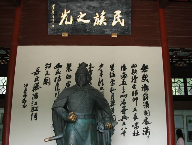 游人進(jìn)岳廟參觀,頭門是一座二層重檐建筑,巍峨莊嚴(yán),正中懸掛“岳王廟”三字豎匾,繼而是一個天井院落,中間是一條青石鋪成的甬道,兩旁古木參天。正殿忠烈祠重檐中間懸著一塊“心昭天日”橫匾,是葉劍英的手筆。大殿正中是彩色4.5米的岳飛塑像,身著紫色蟒袍,臂露金甲,顯示了武將的英雄氣概。岳飛生前是無資格穿蟒袍的,因后封鄂王,所以身著蟒袍。