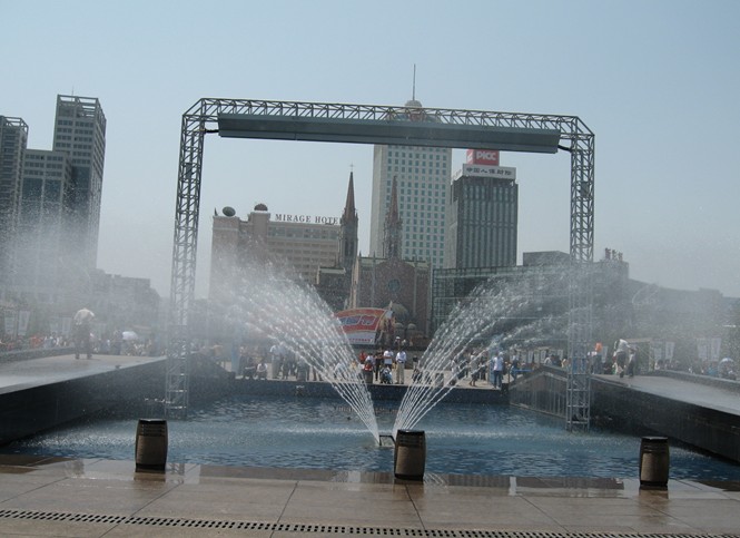 進(jìn)入廣場后跨過二座平行的小橋,便是亞洲最大的音樂噴泉和超大水幕電影??偼顿Y4000萬元的水景系統(tǒng)呈“L”型,總長200米,主噴泉長達(dá)95米,與廣場的中心舞臺遙相呼應(yīng),主噴泉的核心是兩座橋之間的號稱“擎天柱”的噴泉,中心的一支大口徑的噴嘴射出直徑達(dá)38毫米的水柱,噴高可達(dá)40米,形成一柱擎天之勢;整個(gè)音樂噴泉有2000個(gè)噴嘴,400多臺水泵,全部由電腦控制,采用目前國際上最先進(jìn)的高壓氣泵式激光音樂噴泉技術(shù),噴泉在激光和音樂的配合下,能高速噴出一個(gè)個(gè)晶瑩透亮的水柱、水花、能組合出令人眼花繚亂的“高崗花式”、“華爾茲花式”、“蝴蝶展翅式”等幾百種噴泉花式,形成一個(gè)美不勝收的“水世界”;同時(shí)與噴泉交相輝映的水燈也大放異彩,隨著音樂的變化,一個(gè)赤橙黃綠青藍(lán)紫的“水光舞臺”,通透明亮,宛如仙境,令人目不暇接,贊嘆不已。在廣場的兩側(cè),噴射的水墻組成一個(gè)高20米,寬60米的扇形水幕,對面的建筑上射過來的一道光束和激光投射在晶瑩透明的水幕上,水珠如霰如霧,色彩斑斕的光束與水幕交相輝映,形成一組組生動活潑的畫面——這就是天一廣場的大屏幕水幕電影,巨大的水幕電影中景觀人像清晰可感,恍如夢境,又仿佛觸手可及,令人驚奇。