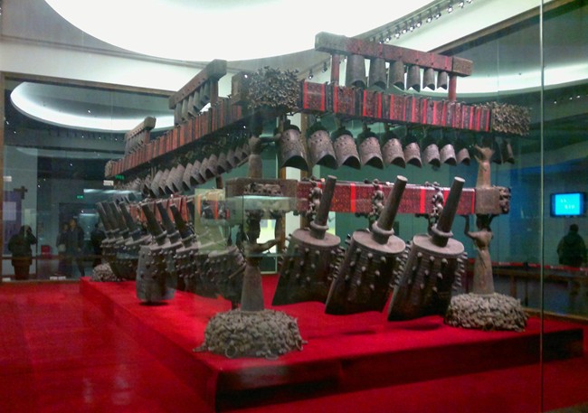 曾侯乙編鐘:時(shí)期為戰(zhàn)國(guó)時(shí)期,1978年湖北隨縣曾侯乙墓出土。鐘架長(zhǎng)748厘米,高265厘米,重4.5噸左右。全套編鐘共六十五件,分三層,八組懸掛在呈曲尺形的銅木結(jié)構(gòu)鐘架上。每件鐘均能奏出呈三度音階的雙音,全套鐘十二個(gè)半音齊奏,可以旋宮轉(zhuǎn)調(diào)。音階為現(xiàn)今通用的C大調(diào),能演奏五聲、六聲或七聲音階樂曲。
