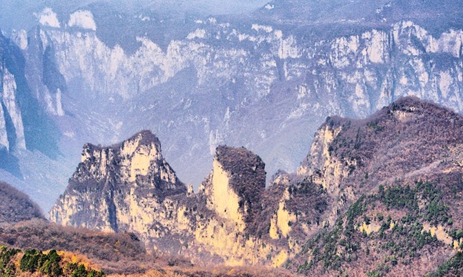 茱萸峰,俗名小北頂,峰頂有真武大帝廟、天橋、云梯。相傳,王維名詩《九月九日憶山東兄弟》:“獨在異鄉(xiāng)為異客,每逢佳節(jié)倍思親,遙知兄弟登高處,遍插茱萸少一人。”即于此峰有感而作。登上峰頂,極目遠(yuǎn)眺,可見黃河如銀帶;俯視腳下,群峰形似海浪涌。山頂氣候多變,倏忽間風(fēng)起云生,白霧從山間咕嘟嘟地涌出,紅日隨即隱去。山峰在云霧中出沒,云騰山浮,如臨仙界。峰腰有藥王洞,深30米,直徑10米,相傳是唐代藥王孫思邈采藥煉丹的地方,藥王洞口有古紅豆杉一株,高約20米,樹干粗達(dá)三人合抱,枝繁葉茂,樹齡在千年左右,是國內(nèi)罕見的名木。另有“廚灶洞”、“閻王洞”、“黃泥洞”等十余個洞穴。景點內(nèi)的名泉一斗水,泉狀若小井,水涌平地面,終年不涸不溢。另外,杜鵑峰、浮丘峰、翠微峰、云門峰也都各具特色。