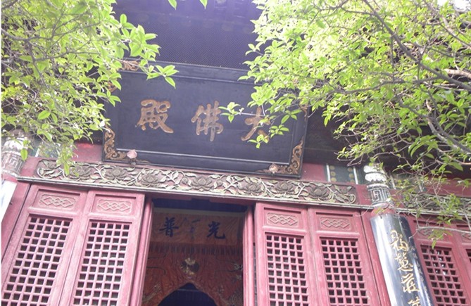 大佛殿之后,是一座懸山式建筑“大雄殿”。它長22.8米,寬14.2米。殿前有一月臺,是寺院內最大的殿宇。由歇山頂改為懸山頂,面積有所縮小。殿內貼金雕花的大佛龕內塑的是三世佛:中為婆娑世界的釋迦牟尼佛,左為東方凈琉璃世界的藥師佛,右為西方極樂世界的阿彌陀佛。三尊佛像前,站著韋馱、韋力兩位護法天將的塑像,執(zhí)持法器。兩側排列十八尊神態(tài)各異、眉目俊朗的羅漢塑像。這十八羅漢都是用漆、麻、絲、綢在泥胎上層層裱裹,然后揭出泥胎,制成塑像,這種“脫胎漆”工藝叫夾苧干漆工藝,在國內是獨一無二的,乃寺中塑像之精品,每座佛都是空心的,一只手即可托起。背后殿壁上還排列整齊地刻鏤著五千余尊微型佛像。大雄殿后有接引殿,為一般寺院所罕見。長14米,進深10.7米。為雙層殿基,是寺內最小建筑。殿內供西方三圣。中為阿彌陀佛立像,左邊為持凈瓶的觀世音菩薩,右邊握摩尼寶珠的是大勢至菩薩,均為清代泥塑。